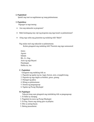 Ang dokumento ay isang plano ng aralin sa Filipino IV na naglalayong ituro ang tamang paggamit ng malalaking titik sa pagsulat. Kasama rito ang mga gawain tulad ng pagsusuri ng mga pangungusap, pagtalakay sa mga idyoma, at mga aktibidad upang maipakita ang mga kaalaman ng mga mag-aaral sa pag-iimbak ng pagkain. Ang mga takdang-aralin ay nakatuon sa paggamit ng tamang pangalan, lugar, at mga pamagat sa mga pangungusap.