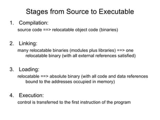 The document outlines the stages of compilation from source code to executable files, including key processes like lexical analysis, syntactic analysis, and semantic analysis. It describes the conversion of code into relocatable object code, the linking of multiple binaries, and the final loading into memory for execution. The document also touches on optimization stages that enhance code efficiency and address machine-specific requirements.