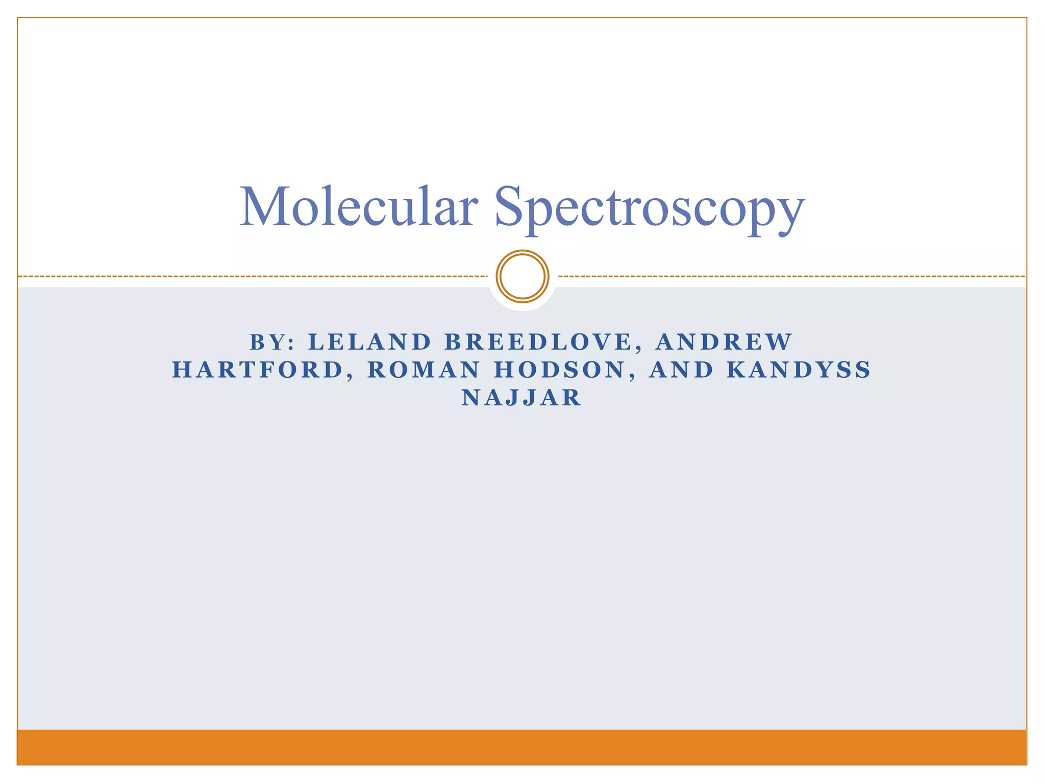 Molecular spectroscopy techniques can be used to analyze the absorption and emission spectra of molecules like carbon monoxide and iodine gas. Andrew Hartford analyzed the rovibrational spectrum of carbon monoxide through its fundamental absorption spectrum between 1950-2275 cm-1 and first overtone between 4100-4400 cm-1. He fit the data to linear, quadratic, and cubic functions to extract molecular constants. Leland Breedlove measured the absorption spectrum of iodine gas and emission spectrum when excited by an argon laser. He plotted the bandhead energies versus vibrational quantum numbers to determine relationships between energy levels. Kandyss Najjar investigated the global warming potentials of methane and nitrous oxide by measuring