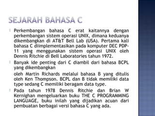 Dokumen tersebut merangkum tentang sejarah dan karakteristik bahasa pemrograman C. Bahasa C pertama kali dikembangkan pada tahun 1970-an di Bell Labs dan mengambil banyak ide dari bahasa BCPL dan B. Pada tahun 1978, buku The C Programming Language diterbitkan dan menjadi acuan utama bahasa C. Karakteristik utama bahasa C adalah portabilitas, efisiensi, fleksibilitas, dan kemampuan menghasilkan program yang