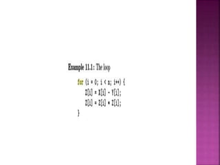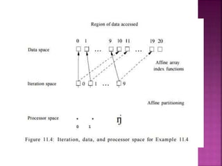 The document provides an overview of basic concepts related to parallelization and data locality optimization. It discusses loop-level parallelism as a major target for parallelization, especially in applications using arrays. Long running applications tend to have large arrays, which lead to loops that have many iterations that can be divided among processors. The document also covers data locality and how the organization of computations can significantly impact performance by improving cache usage. It introduces concepts like symmetric multiprocessors and affine transform theory that are useful for parallelization and locality optimizations.