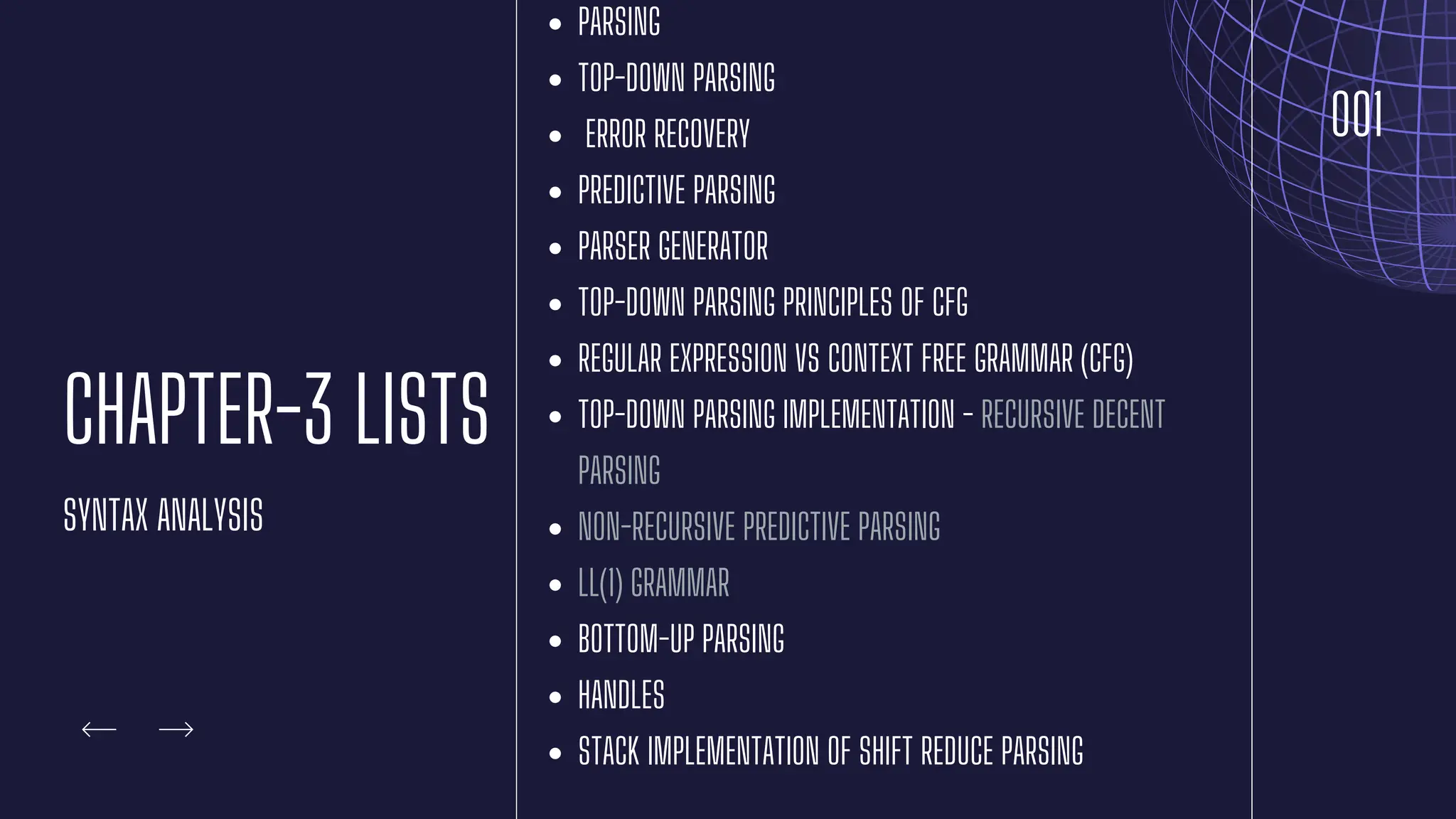 The document discusses parsing and syntax analysis in compiler design, detailing techniques like top-down and bottom-up parsing, the role of context-free grammar (CFG), and the generation of parse trees. It explains syntax-directed translation (SDT), describing the combination of grammar specifications with semantic actions for translation and validation of programs, and outlines types of attributes used in parsing. Additionally, it contrasts regular expressions with context-free grammars in terms of their utility in defining lexical and syntactic structures.