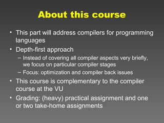 The document outlines a course on compiler construction, emphasizing a depth-first approach to compiler stages, particularly focusing on optimization and code generation. It covers the use of tools like lex and yacc for lexical analysis and parsing, detailing their functionalities and the integration process. Additional topics include various optimization techniques, code organization, and the management of compilation errors.