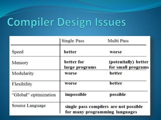 A compiler is a program that translates source code written in one programming language into another target language. It performs several steps including lexical analysis, parsing, code generation and optimization. The compiler consists of a front end that checks syntax and semantics, a middle end that performs optimizations, and a back end that generates assembly code. Compilers can be single pass or multi pass and are used to translate from high-level languages like C to machine-executable object code.
