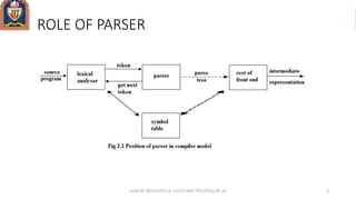 A parser is a program component that breaks input data into smaller elements according to the rules of a formal grammar. It builds a parse tree representing the syntactic structure of the input based on these grammar rules. There are two main types of parsers: top-down parsers start at the root of the parse tree and work downward, while bottom-up parsers start at the leaves and work upward. Parser generators use attributes like First and Follow to build parsing tables for predictive parsers like LL(1) parsers, which parse input from left to right based on a single lookahead token.