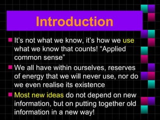 1) Applying existing knowledge in new ways is often the source of new ideas, not new information. Standing still is the fastest way to move backwards in a rapidly changing world.