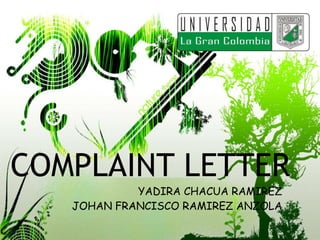 This document provides guidance on writing an effective complaint letter. A complaint letter describes damage, errors, or mistakes made regarding delivered goods and requests compensation. It should be used when unhappy with a product or service. The letter should state the reason for writing, give evidence-supported reasons for complaining, and be concise, authoritative, factual, constructive, and friendly.