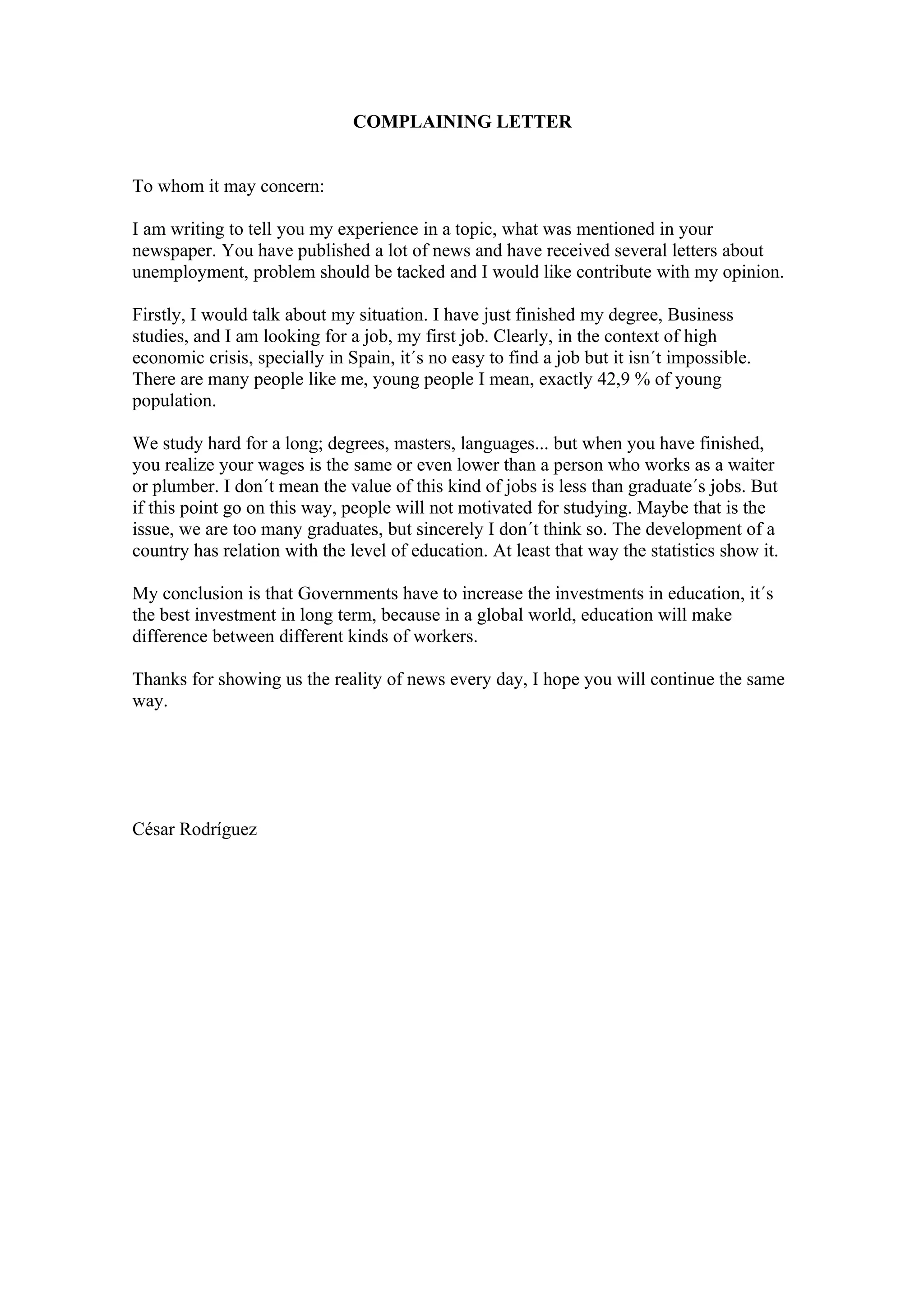 The writer is looking for their first job after completing a business degree but is struggling due to high unemployment, especially in Spain. They explain that many young people are also unemployed despite studying for degrees and languages. While jobs like waiting tables pay the same or more, the writer believes governments should invest more in education to develop skilled workers and improve the economy long-term.