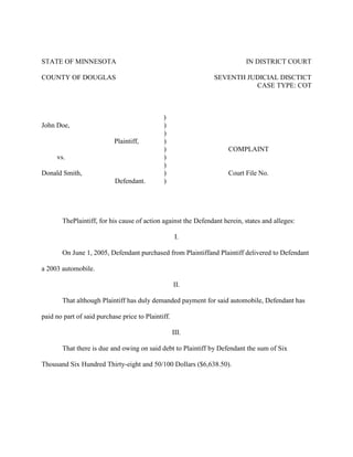 John Doe is suing Donald Smith for $6,638.50, the unpaid balance for a 2003 automobile Doe sold and delivered to Smith on June 1, 2005. Doe alleges that although payment has been demanded, Smith has not paid any part of the purchase price. Doe is seeking a judgment against Smith for the $6,638.50 balance plus interest, costs and disbursements. The complaint is signed and notarized by Doe's attorney, Mavis M. Pattee.