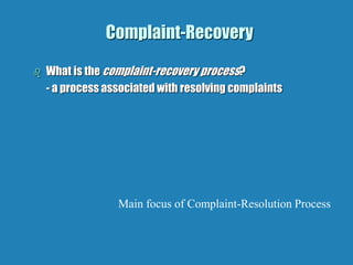 This document discusses how to properly implement a complaint-recovery strategy. It defines a complaint as anything that lets someone know their needs have not been met. Complaints are not always bad, as resolving them satisfactorily builds customer loyalty. The complaint-recovery process involves creating an accommodation strategy, training employees to listen empathetically and apologize, offering solutions, and learning from mistakes through surveys. Proper employee training is key, and strategies must be tested and adapted based on customer feedback.