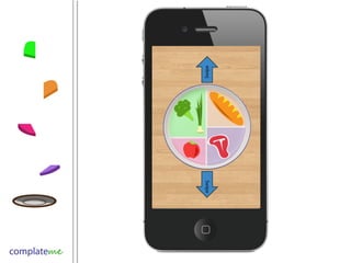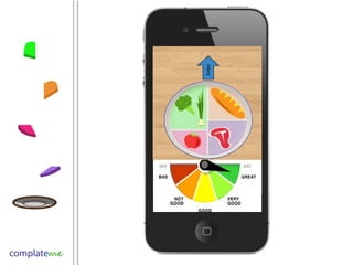 ComplateMe is a new way to track meals and customize diets through an engaging interface to make healthy eating positive. It identifies what is missing from meals, educates with nutritional facts, and queries preferences over time to reward users with badges for unlocking features. The app aims to help American adults and those buying their own groceries by addressing issues with typical diet programs like tedious tracking and inability to sustain users long-term. It sees potential growth through extra features and revenue from selling aggregated user data and partnering with retailers.