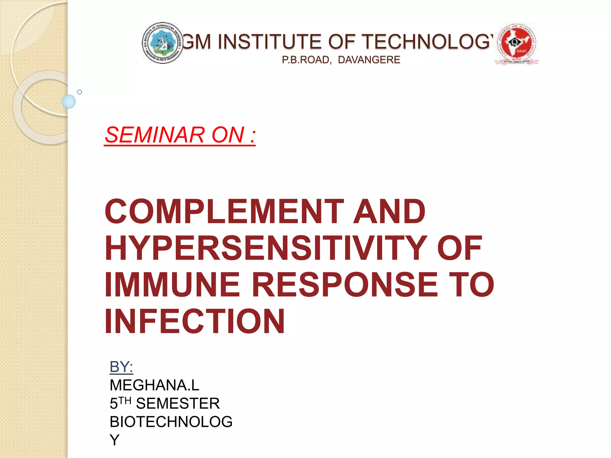 This document summarizes a seminar presentation on the complement system and hypersensitivity of the immune response. It provides an overview of the complement system, including that it is comprised of 20 plasma proteins that form an essential part of innate immunity. It describes the three pathways of complement system activation - the classical, alternative, and lectin pathways. It also outlines the four types of hypersensitivity reactions classified by Gell and Coombs.