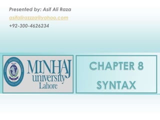 This document provides an overview of syntax and generative grammar. It defines syntax as the way words are arranged to show relationships of meaning within and between sentences. Grammar is defined as the art of writing, but is now used to study language. Generative grammar uses formal rules to generate an infinite set of grammatical sentences. It distinguishes between deep structure and surface structure. Tree diagrams are used to represent syntactic structures with symbols like S, NP, VP. Phrase structure rules, lexical rules, and movement rules are discussed. Complement phrases and recursion are also explained.