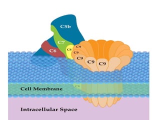 The complement system is part of the innate immune system and consists of over 20 proteins that complement the function of antibodies and immune cells. It can be activated via the classical pathway by antibodies binding to pathogens or via the alternative pathway through direct binding of C3 protein to pathogens. Both pathways result in the formation of the membrane attack complex that creates pores in the pathogen's membrane to kill it. The complement system is tightly regulated to prevent damage to host cells and deficiencies can increase susceptibility to certain infections.
