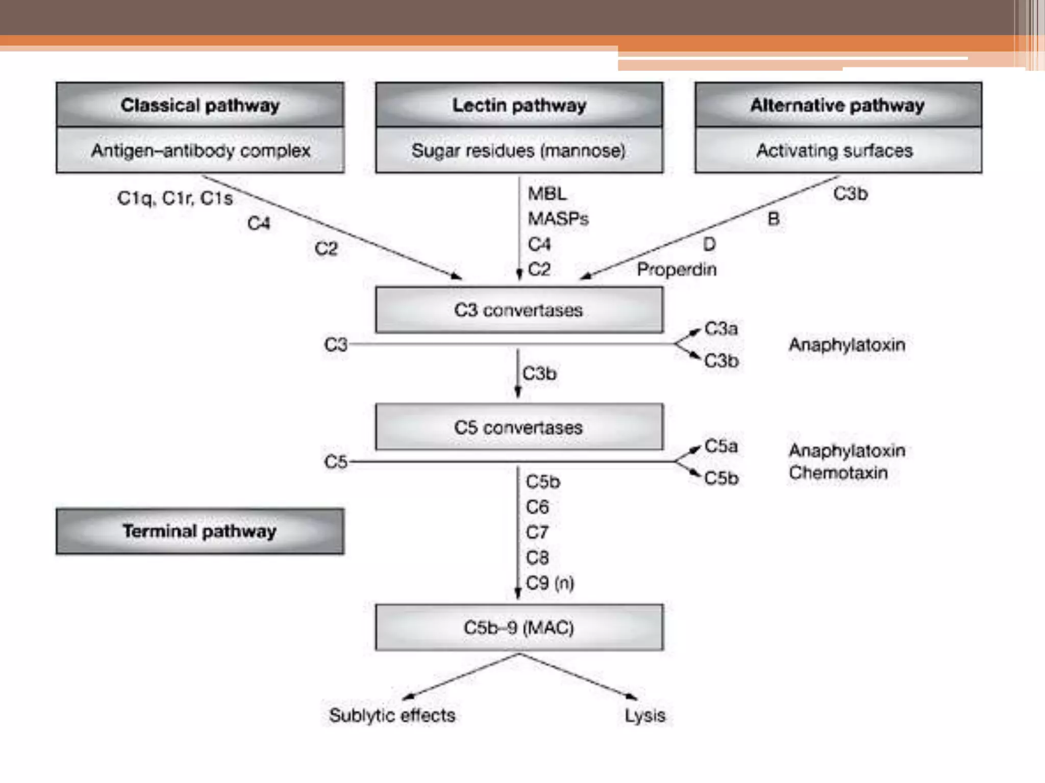 The complement system is a group of soluble proteins that activate inflammation, opsonization, and cell lysis in response to microbial agents. It functions via three pathways - the classical, lectin, and alternative pathways - which involve a sequential activation of complement components from C1 to C9. This leads to the formation of the membrane attack complex (MAC) and results in opsonization, chemotaxis of neutrophils, increased vascular permeability, and cellular lysis. The complement system is regulated by proteins like C1 inhibitor and decay accelerating factors to prevent damage to host cells.