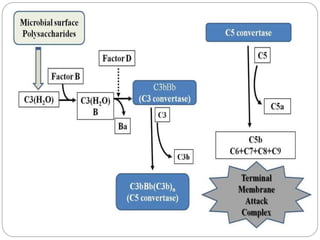 The complement system is a vital part of the immune response composed of over 30 soluble plasma proteins, enhancing both innate and adaptive immunity. It operates through multiple pathways, including the classical, alternative, and lectin pathways, which activate a cascade leading to the formation of the membrane attack complex (MAC) that lyses bacterial cells. Each pathway plays a distinct role in opsonization, inflammation, and the clearance of immune complexes, with specific components facilitating these processes.