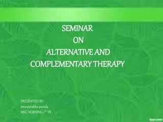 This document provides an overview of a seminar presentation on complementary and alternative therapy. It begins with introductions and definitions of complementary and alternative therapies. It then discusses the major categories of alternative therapies like homeopathic, naturopathic, traditional Chinese medicine, Ayurvedic treatment, and mind-body interventions. Specific alternative therapies like yoga, meditation, massage, and acupuncture are explained. The document concludes by discussing the increasing role of nurses in incorporating alternative therapies into patient care.