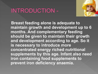 This document provides guidance on complementary feeding or weaning for infants after 6 months of age. It states that breast milk alone is not sufficient to meet nutritional needs after 6 months and other foods should be gradually introduced along with continued breastfeeding. It provides recommendations on appropriate food consistencies, frequencies and amounts at different ages, ensuring hygienic preparation and storage of weaning foods. The document also outlines signs that an infant is ready for complementary feeding and the advantages and disadvantages of weaning.
