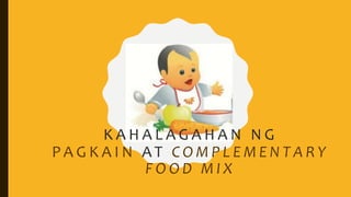 Ang dokumento ay naglalarawan ng kahalagahan ng complementary feeding para sa mga sanggol simula sa anim na buwan. Tinutukoy nito ang '1 + 3' na sistema ng pag-uuri ng mga pagkain sa tatlong grupo: mga nagbibigay ng lakas, nagtataglay ng protina, at nagtataglay ng bitamina at mineral. Ipinapakita rin ang mga pahinang dapat tandaan upang matiyak na ligtas at sapat ang pagkain para sa mga sanggol.