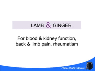 This document provides food pairings and their health benefits, recommending lamb and ginger for kidney function and pain relief, chicken and chestnuts for spleen and blood circulation, duck and yam for lung health, fish and tofu as a protein source, and pork liver and spinach for treating anemia. Each food pairing is said to provide a specific health benefit.