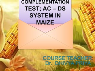 The document discusses the Ac-Ds transposable element system in maize and complementation testing. It notes that Ac is an autonomous transposable element that enables the movement of Ds elements. McClintock discovered that Ac, Ds, and the C gene are responsible for color instability in maize seeds. Complementation testing determines if two recessive mutations represent alleles of the same gene or different genes.