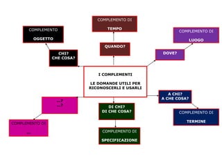 I complementi sono parti del discorso utili per arricchire i testi con informazioni. Si riconoscono facendo domande specifiche come 'quando?', 'chi?' e 'dove?'. Le domande aiutano a identificare e utilizzare vari tipi di complementi, come complemento di tempo, di oggetto e di luogo.