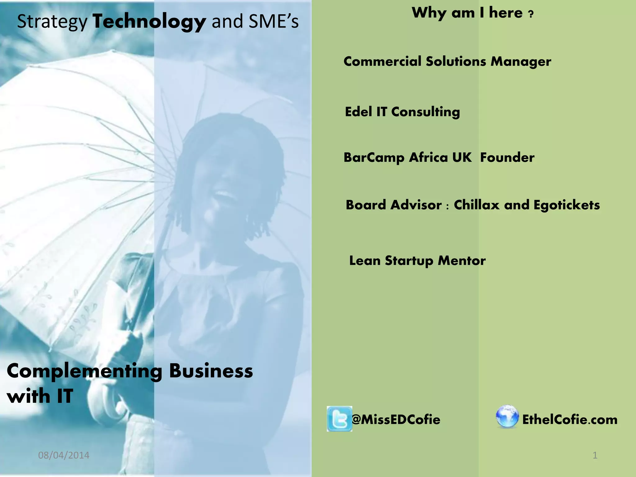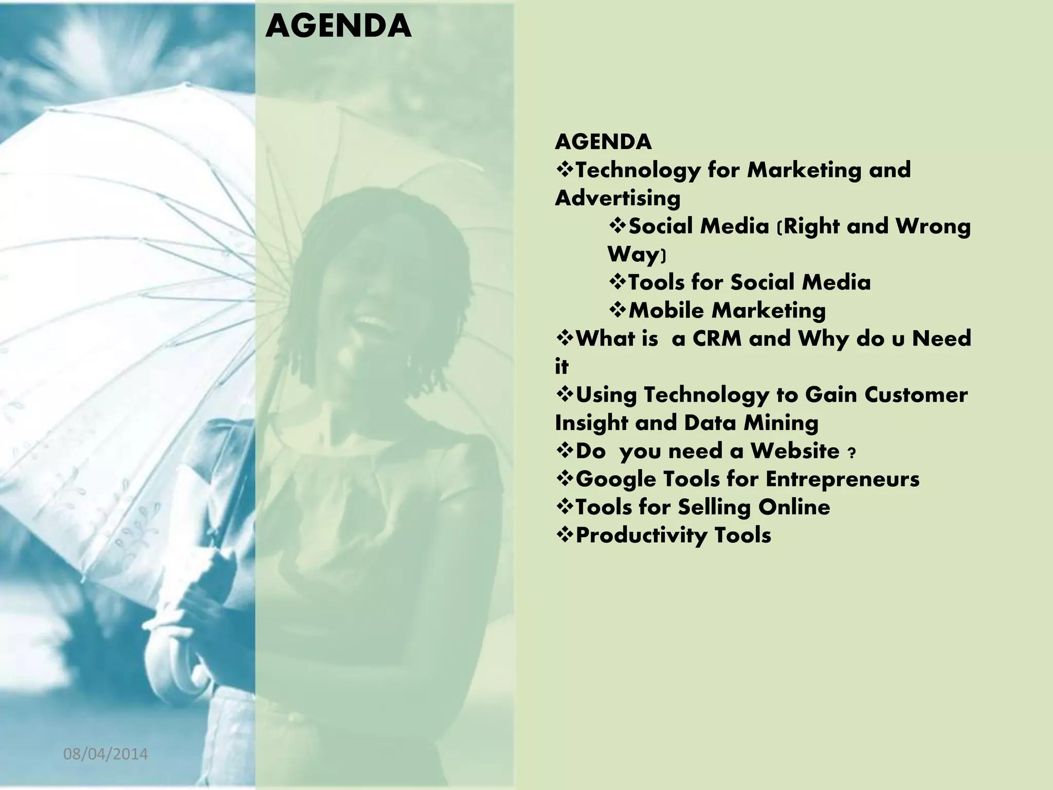The document outlines a presentation on utilizing technology to enhance marketing, customer relationship management (CRM), and productivity for small and medium enterprises (SMEs). It emphasizes the importance of social media, mobile marketing, and customer insights, providing various tools and strategies for effective digital engagement and business growth. Case studies illustrate successful applications of these concepts in real-world scenarios.