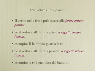 Il documento spiega la differenza tra frasi attive e passive, evidenziando il ruolo del soggetto nelle due forme verbali. Nelle frasi attive, il soggetto compie l'azione, mentre nelle frasi passive subisce l'azione, con il complemento d'agente che indica chi agisce. Viene inoltre descritto il complemento di causa efficiente, che si riferisce a eventi compiuti da non persone, come nelle frasi passive.