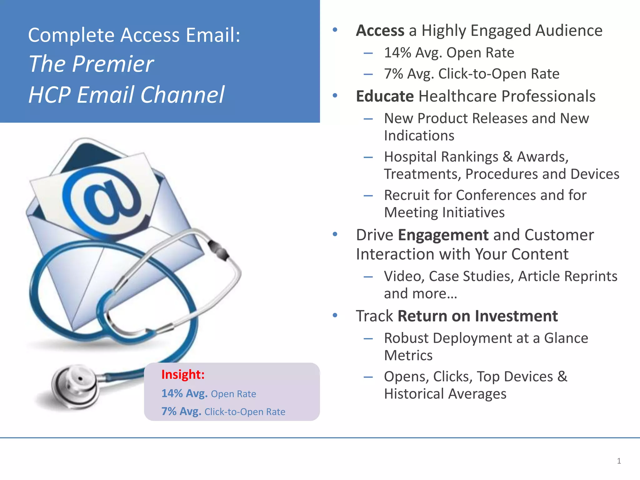 - The document discusses using Complete Access Email (CAE), a premier email channel, to reach healthcare professionals (HCPs) with a 14% average open rate and 7% average click-to-open rate.