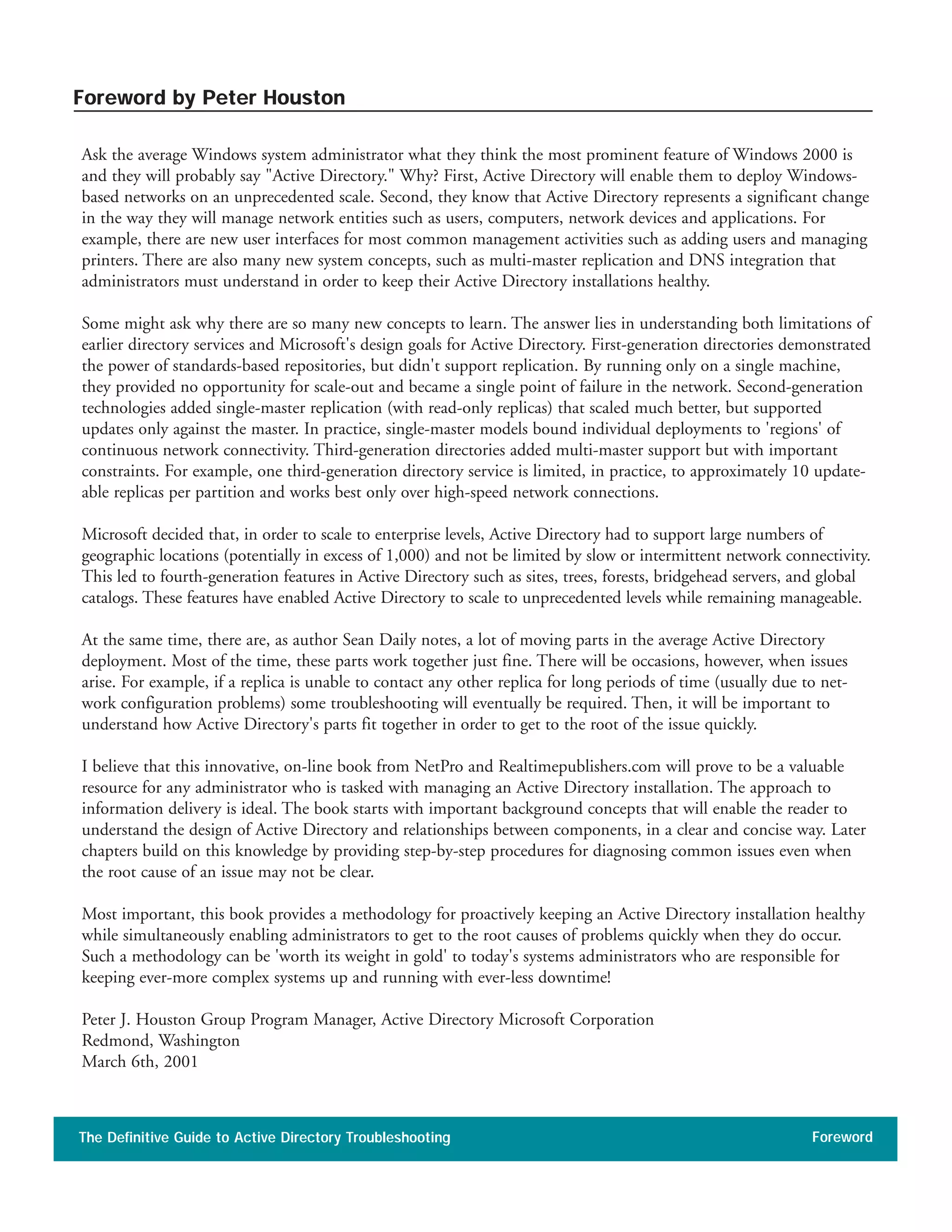 The document discusses the key features of Active Directory (AD) in Windows 2000. It explains that AD represents a significant change from previous directory services by supporting unprecedented scale through features like multi-master replication, sites, and global catalogs. It also notes that while AD's various components generally work well together, occasional issues will arise due to its complexity, requiring administrators to understand how all the parts fit together to quickly troubleshoot problems.