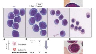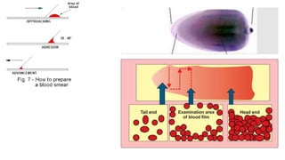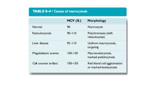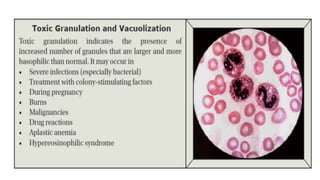 The document provides an extensive overview of complete blood count parameters, including hematocrit, hemoglobin, white blood cells, and platelet counts, along with their normal ranges and various conditions leading to abnormalities. It discusses factors causing increased or decreased blood components, such as anemia, leukocytosis, and thrombocytopenia, as well as the clinical implications of these variations. Additionally, it details specific morphologies and their associations with different pathologies, emphasizing the significance of proper analysis in diagnosing hematological disorders.