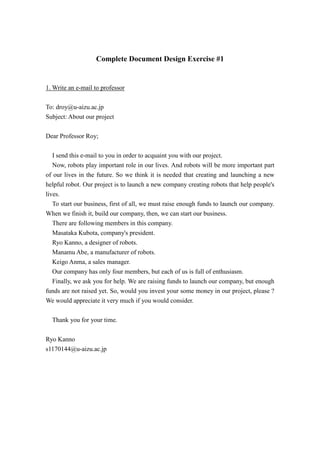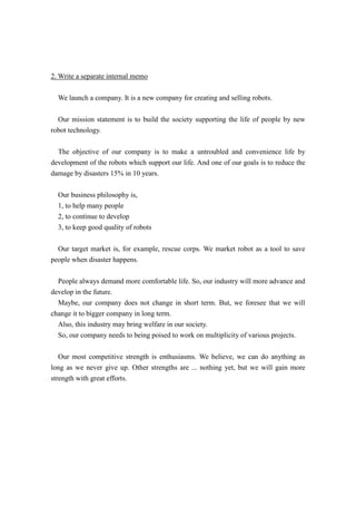 The document contains an email draft and internal memo for a new robotics company. The email is to a professor requesting an investment in the company. It introduces the four founding members and their goal of creating helpful robots. The internal memo outlines the company's mission to support life through robot technology. It defines objectives, business philosophy, target markets, and competitive strengths as enthusiasm.