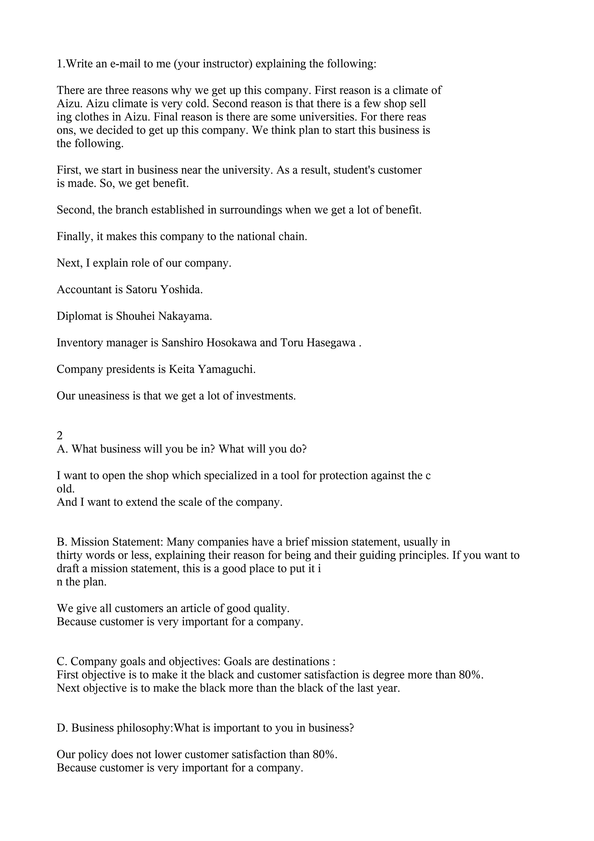 The document outlines a business plan for opening a clothing shop in Aizu, Japan. The shop will specialize in cold weather gear. Key points include: