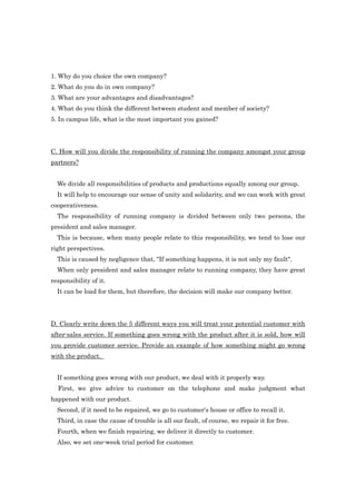 The document outlines plans for starting a new robotics company. It discusses 5 points for advertising the business in the community, including making rescue and assistance robots for disasters and disabilities. It also discusses setting up a human resources division to hire employees, with 5 sample interview questions. Responsibilities for running the company would be divided between a president and sales manager. After-sales customer service plans include advice over the phone, product repairs either on-site or by returning it, and a one-week trial period. Market research methods include online searches of competitors, analyzing their brochures, and studying academic market data sources.