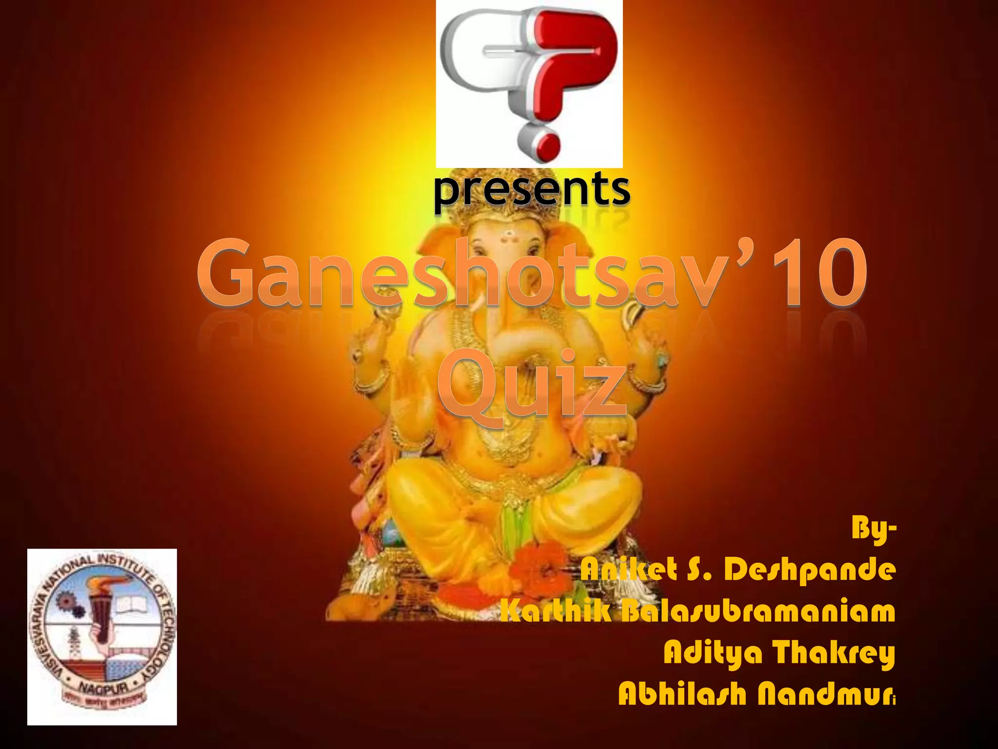 The document appears to be a quiz related to Ganeshotsav celebrations in 2010. It contains 25 multiple choice questions testing knowledge of topics like books, movies, music and more. The questions are attributed to four authors and there are rules stating the quiz is worth a total of 5 points for the 5 marked questions.