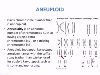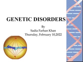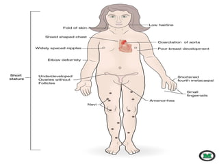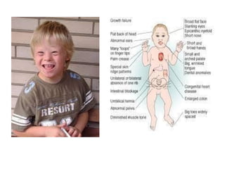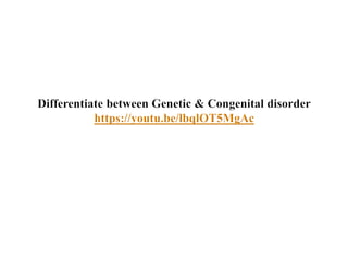 This document provides an overview of learning objectives and key concepts regarding genetic disorders. The objectives are to differentiate genetic from congenital disorders, define terms like trisomy and monosomy, discuss chromosomal defects and aneuploidy, and describe several specific genetic disorders. It defines genetic disorders as caused by DNA abnormalities and congenital disorders as existing at or before birth. It provides examples of genetic and congenital disorders, defines terms like trisomy and monosomy, and describes Down syndrome, Turner syndrome, and Klinefelter syndrome in detail including their causes and characteristics.