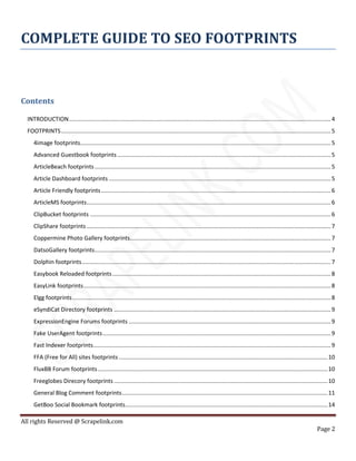 The document provides a comprehensive guide to SEO footprints, including various types of footprints used for building backlinks from different platforms like forums, blogs, and guestbooks. It emphasizes the importance of utilizing specific codes and phrases related to popular scripts (e.g., phpbb, vbulletin) to aid in identifying target sites for backlink placement. Additionally, it advises using premium scraping proxies for effective results when harvesting data from search engines.