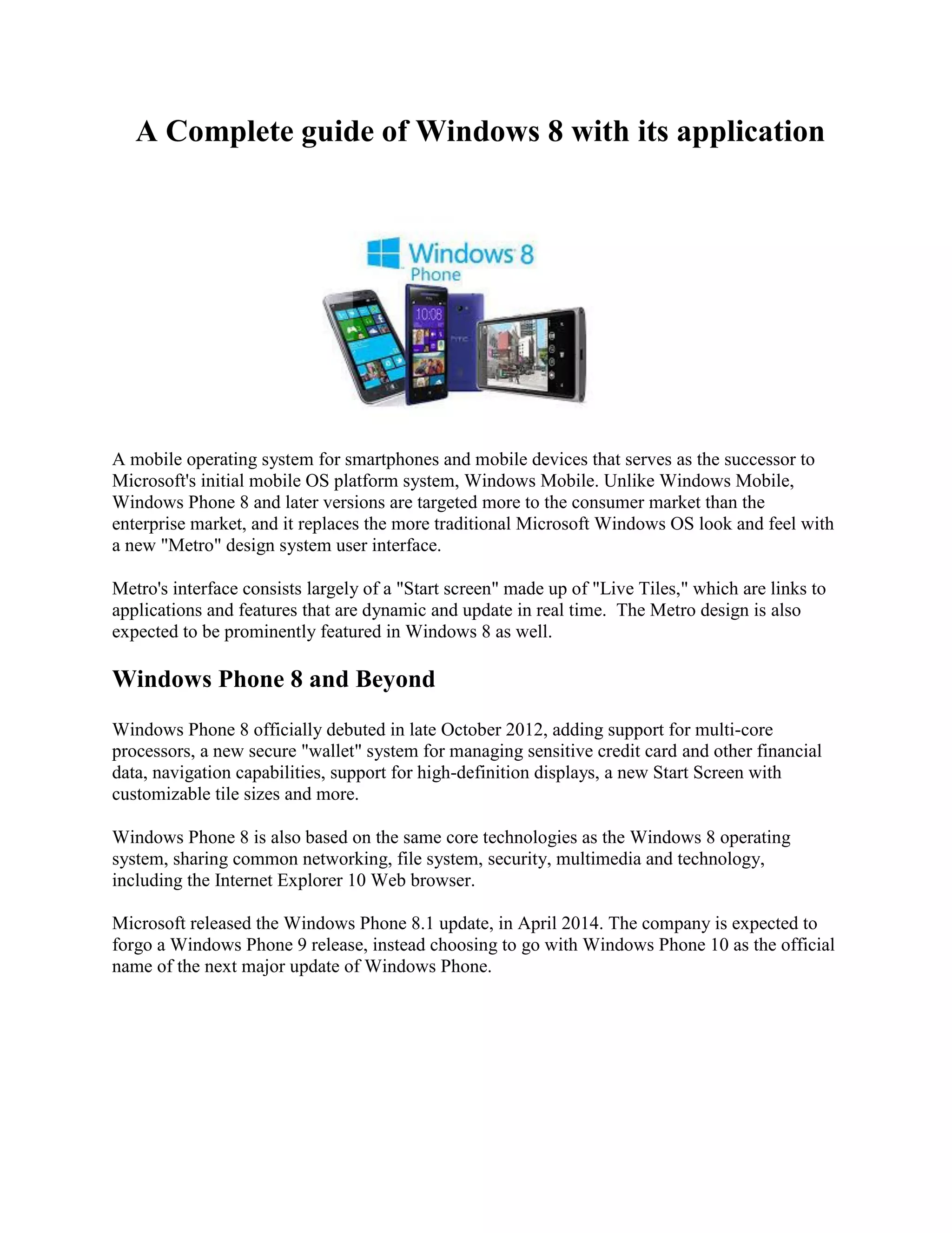 The document provides an overview of Windows Phone 8 and its applications, detailing its shift from a business-centric OS to a consumer-focused one featuring a 'metro' design. It highlights key features such as support for multi-core processors, improved security, and enhanced display options, along with a booming app market. Additionally, it discusses the architecture and future developments, including the anticipated Windows Phone 10 update and the integration with Windows 10 across devices.