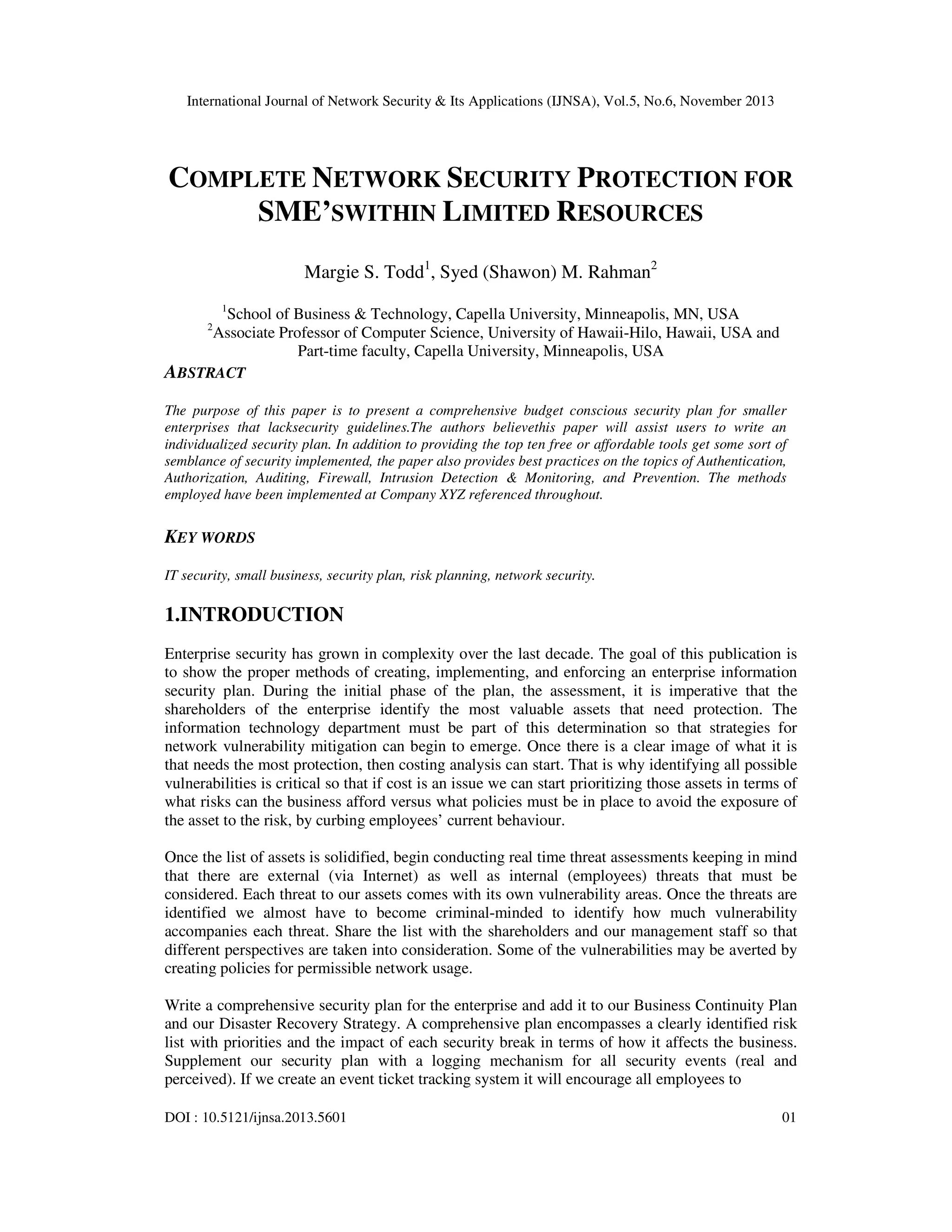 The paper presents a budget-friendly security strategy for small enterprises that lack security guidelines, emphasizing the creation of individualized security plans and implementing affordable security tools. It outlines the importance of risk assessment, prioritizing threats, and establishing policies to protect significant assets while minimizing vulnerabilities. Additionally, the document provides a list of ten cost-effective security measures and discusses incorporating both physical and digital security into a comprehensive security plan.