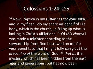 This passage from Colossians discusses Paul's ministry and message to the church. Paul rejoices in his sufferings for the church, which fills up what is lacking in Christ's afflictions. He was appointed by God to preach the mystery of Christ being formed in believers. Paul's message includes proclaiming Christ, teaching wisdom to present believers as complete or perfect in Him. He works hard through God's power to strengthen believers so that no one deceives them from the full and true knowledge of God revealed in Christ.