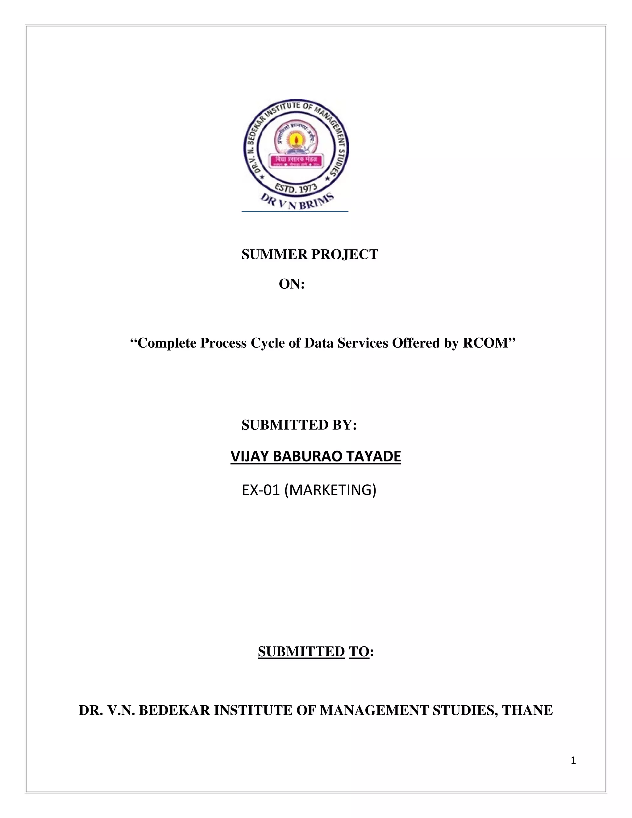 The document outlines a summer project focusing on the complete process cycle of data services offered by Reliance Communications (RCom), detailing its history, services, and business model. It describes RCom as one of the leading telecommunications companies in India, providing an extensive range of data services and aiming to enhance customer experience. The project aims to understand the availability, requirements, and sales processes of these data services in the market.