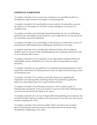 The document describes a complete surrender of all aspects of the author's being and qualities to their newly born daughter. These include their exuberance, artistry, dynamism, sensitivity, freedom, blood, perspiration, fantasy, temerity, integrity, positivity, aura, desires, voice, mind, body, spirit, and shadow. The author surrenders everything bestowed upon them by God to their daughter, who they see as a Goddess of love and sole messiah who has blessed them with more joyful lives.
