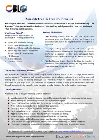 The Complete Train the Trainer course is a five-day certification program aimed at enhancing training techniques for professionals in HR, teaching, and training roles. Participants will learn to customize training materials, assess performance gaps, and apply adult learning principles, with an emphasis on practical activities and the use of e-learning strategies. The course includes a participant handbook, training tools, and follow-up sessions, with registration fees set at INR 12,500 per participant.