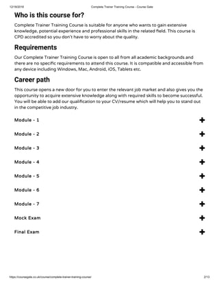 The Complete Trainer Training Course offered by Course Gate is designed to enhance the skills and competencies of individuals aiming for a career in training. It covers essential trainer roles, communication skills, employee motivation, and understanding workplace psychology, making it suitable for all academic backgrounds. The course is CPD accredited, flexible across devices, and can significantly boost career prospects by adding a qualification to a resume.