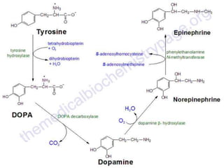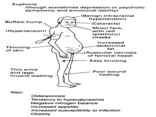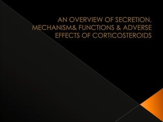 The document discusses the anatomy, embryology, histology, functions and pathologies of the adrenal glands. It covers the hormones produced by the adrenal cortex (cortisol, aldosterone) and medulla (epinephrine, norepinephrine), their roles and regulatory pathways. Key conditions discussed include Cushing's syndrome, Conn's syndrome, Addison's disease and pheochromocytoma. The synthesis, actions and metabolism of adrenal hormones are summarized along with tests used in diagnosis of adrenal disorders.