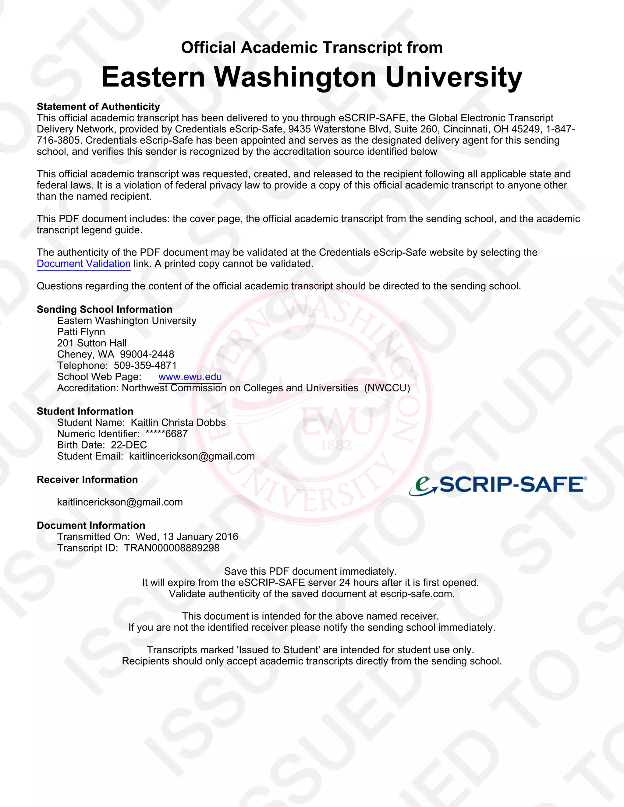 This official transcript from Eastern Washington University documents Kaitlin Christa Dobbs' undergraduate coursework and degree. It shows that she earned a Bachelor of Arts in Government with a Pre-Law concentration on June 12, 2015, graduating summa cum laude. The transcript lists the courses she completed at Eastern Washington University, her grades, and confirms that she maintained a cumulative GPA of 3.92. It also documents various transfer credits she received from previous coursework completed at Bellevue College.