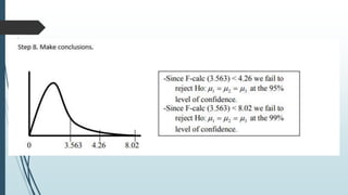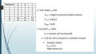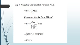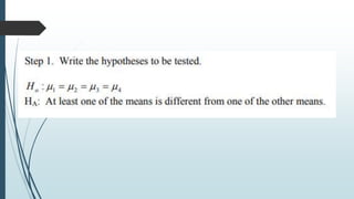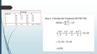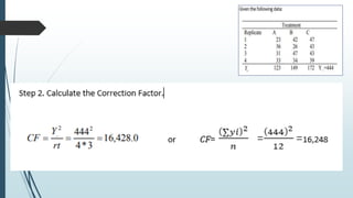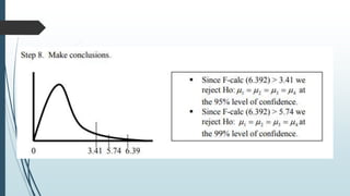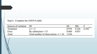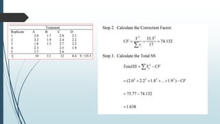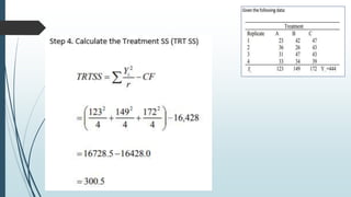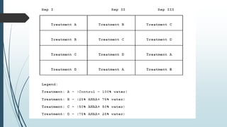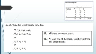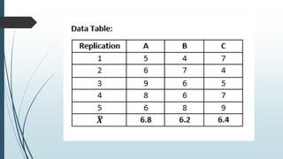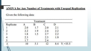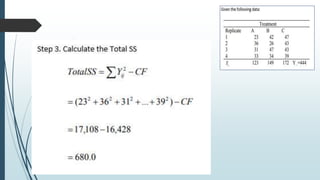 A completely randomized design (CRD) randomly assigns experimental units to different treatment groups so each unit has an equal chance of receiving any treatment. Any variation between units receiving the same treatment is considered experimental error. CRDs are best for homogeneous experimental units where environmental effects can be controlled, like laboratories. They are rarely used for field experiments with more variation. Treatments are administered at different levels or amounts. The randomization process, advantages like simplicity, and sources of variation are outlined. Analysis of variance (ANOVA) can be used to test for significant differences between treatment groups.