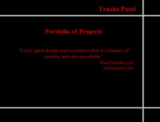 This document contains a portfolio of projects by Trusha Patel. It includes interior design projects for hotels, restaurants, and other commercial spaces located in Arizona, California, Kansas, and Mexico. Specifically, it lists projects for the Ft. McDowell Radisson Hotel and Conference Center in Scottsdale, Arizona, the Sheraton Overland Park Hotel and Convention Center in Overland Park, Kansas, the Cimarron Center in Surprise, Arizona, Tuscan Lifestyles in Scottsdale, Arizona, the Santa Ysabel Resort and Casino in California, and the Services Group of America Corporate Headquarters in Scottsdale, Arizona. Renderings, photos, and details are provided for spaces within each