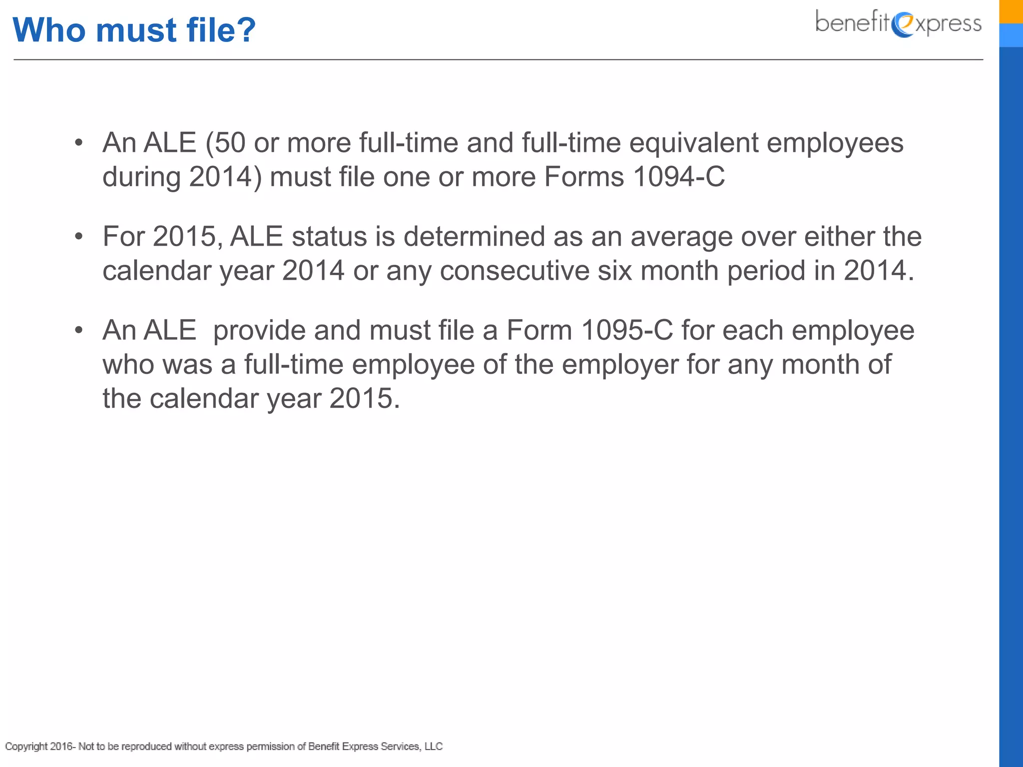 The document outlines the filing requirements for applicable large employers (ALEs) regarding health insurance coverage reporting using Forms 1094-C and 1095-C for the year 2015. ALEs with 50 or more full-time employees must file these forms by specific deadlines and ensure employees receive the required information about their health coverage. It includes detailed instructions on how to complete the forms, applicable codes for various coverage situations, and scenarios for different employment statuses.