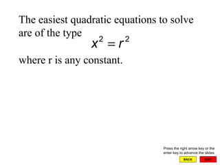 The document discusses completing the square and solving quadratic equations. It explains that completing the square allows any quadratic equation to be written in the form (x - h)2 = k, which can then be solved using the square root property. The quadratic formula is derived from completing the square and provides a general method for solving any quadratic equation in one variable by setting it equal to 0 and substituting the coefficients into the formula. Examples are provided to demonstrate how to use completing the square and the quadratic formula to solve quadratic equations.